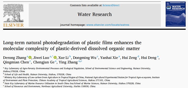 近日,环境领域权威期刊《Water Research》刊发了海南大学环境科学与工程学院土壤健康与可持续利用创新团队的最新研究成果,题为:Long-term natural photodegradation of plastic films enhances the molecular complexity of plastic-derived dissolved organic matter。海南大学资源利用与植物保护专业硕士研究生张德荣为唯一第一作者,罗吉伟副教授为独立通讯作者。