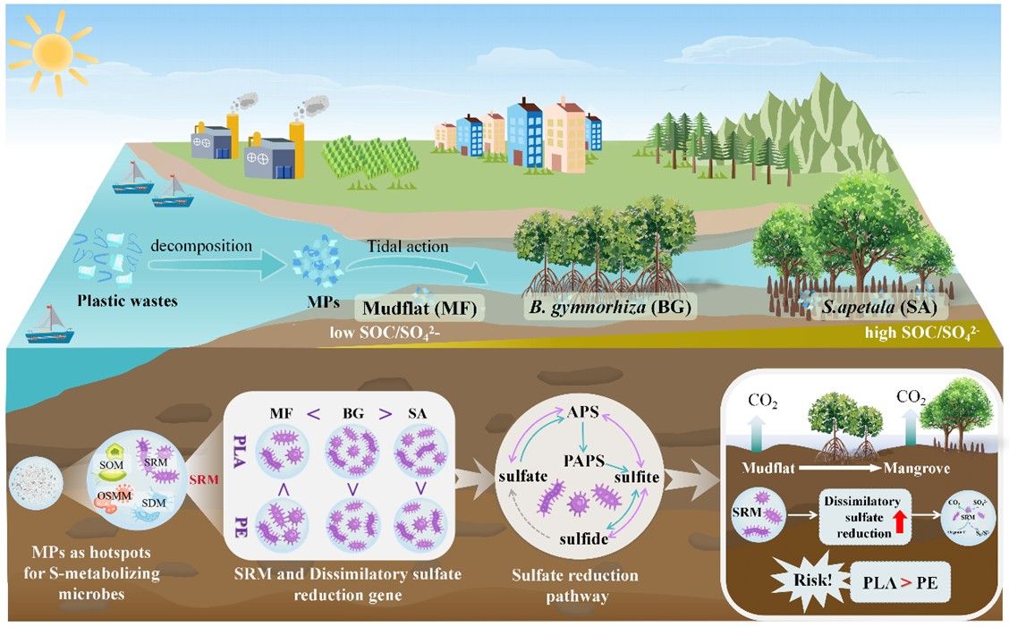 红树林作为海岸带重要的蓝碳生态系统,长期处于硫酸盐富集且厌氧的环境,并已成为微塑料的重要“汇”。然而,微塑料在此类环境中是否作为硫酸盐还原微生物的富集热点,进而影响该系统中碳-硫生物地球化学循环,尚不明确。为此,该论文选取光滩、入侵种无瓣海桑(S. apetala)与原生种木榄(B. gymnorhiza)三种典型生境,开展聚乙烯(PE-MPs)与聚乳酸微塑料(PLA-MPs)的原位暴露实验,系统揭示了不同聚合物类型微塑料在红树林沉积物中富集硫酸盐还原微生物(SRM)的潜在机制。结果表明,PLA-MPs较传统PE-MPs具有更强的SRM富集能力,且异化硫酸盐还原是塑料际中主导的硫代谢途径,其活性呈现明显的生境分异。具体而言,木榄生境中微塑料驱动的硫酸盐还原最为活跃,均高于无瓣海桑与光滩,该过程主要由sat/met3、apr及dsr基因簇协同介导。此外,PLA塑料际CO2释放量显著高于PE-MPs。综上,可降解微塑料的积累可能通过强化碳-硫耦合过程,加剧红树林沉积物中温室气体与硫化物的释放,带来不容忽视的生态风险,这一风险在硫酸盐还原活性较高的原生红树林生境中尤为突出。该研究为理解微塑料污染背景下红树林生态系统碳-硫生物地球化学循环过程提供了关键科学依据。
