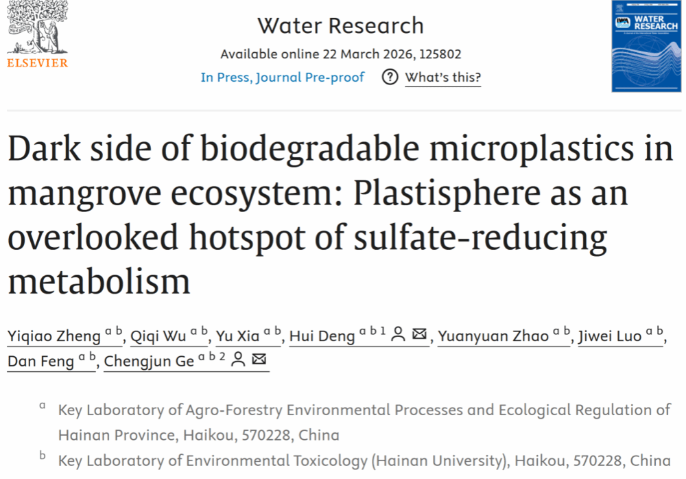 近日,环境领域权威期刊《Water Research》刊发了海南大学环境科学与工程学院新污染物环境归趋与风险评估创新团队的最新研究成果,题为“Dark side of biodegradable microplastics in mangrove ecosystem: Plastisphere as an overlooked hotspot of sulfate-reducing metabolism”。该论文以海南大学为第一通讯单位,环境科学与工程专业硕士研究生郑怡巧为唯一第一作者,邓惠副教授与葛成军教授为共同通讯作者。该研究是团队自2018年以来聚焦热区典型生态系统微塑料污染所取得的又一重要成果。